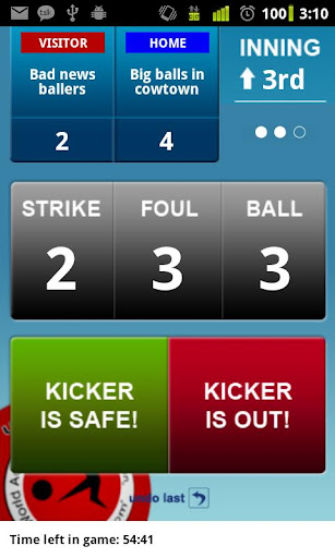 - Download an app. If you have an iphone or android phone you can dowload an app that helps keep track of balls, strikes, fouls outs, innings scores and even game time. The iphone app is called iRef - Kickball and the android app is called Kickball Ref Pro. They are both 99 cents and they are both worth it. If you are on your phone during a game, it should be for using one of these apps only.